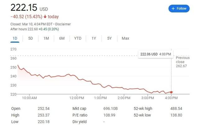 截至美东时间10日收盘,特斯拉股价跌至每股222.06美元,当日跌幅达15.43%。