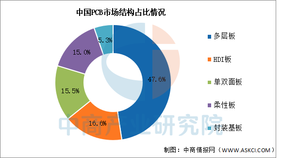 目前,我国多层板占比超过四成,占比达47.6%。其次,HDI板在市场中也占据了一席之地,占比约为16.6%。其次分别为单双面板、柔性板、封装基板,占比分别为15.5%、15.0%、5.3%。