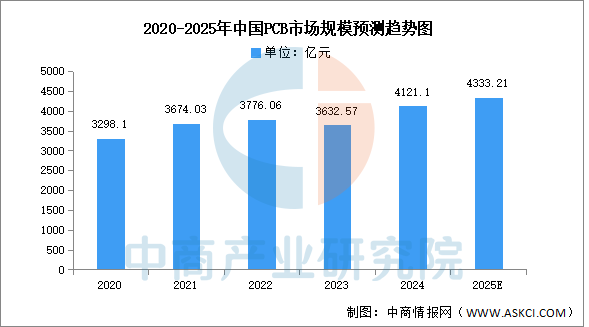 从国内来看,中商产业研究院发布的《2025-2030年中国印制电路板(PCB)行业发展趋势及预测报告》显示,2023年中国PCB市场规模达3632.57亿元,较上年减少3.80%,2024年约为4121.1亿元。中商产业研究院分析师预测,2025年中国PCB市场将回暖,市场规模将达到4333.21亿元。