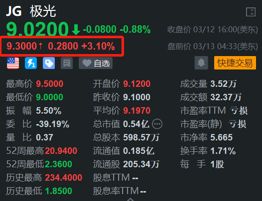 中国领先的客户互动和营销科技服务商极光(JG.US)盘前涨超3%,报9.3美元。