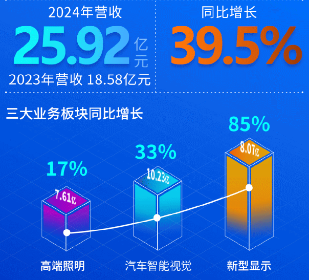 分业务板块来看,晶科电子三大板块均实现增长,高端照明营收7.61亿元,同比增长17%;汽车智能视觉实现营收10.23亿元,同比增长33%;新型显示业务营收8.07亿元,同比增长85%。