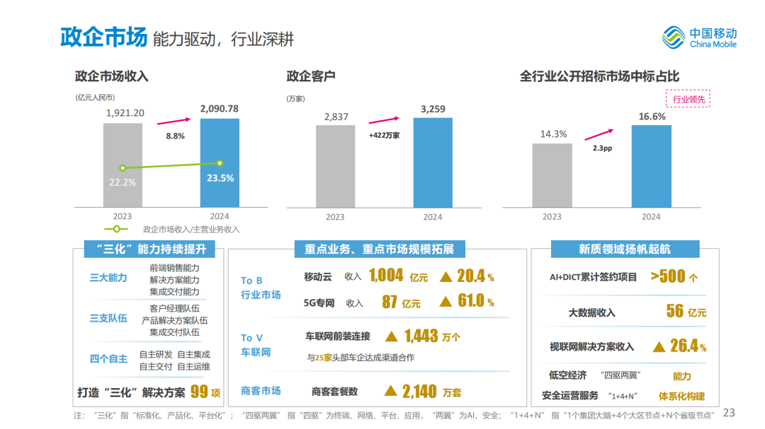 我们一体化推进“网+云+DICT”规模拓展,创新打造“AI+DICT”能力,加快构建“三化(标准化、产品化、平台化)”解决方案运营体系,大力开拓商客价值高地,政企市场实现良好增长。2024年,政企市场收入达到人民币2,091亿元,同比增长8.8%;政企客户数达到3,259万家,净增422万家。公开招标市场中标占比达到16.6%,全行业领先,成功打造融合自有能力的“三化”解决方案99项。锚定“一流云服务商”目标,由云向智,移动云收入达到人民币1,004亿元,同比增长20.4%, IaaS+PaaS收入规模稳居业界前五。5G垂直行业应用保持领先,在智慧城市、智慧工厂、智慧园区、智慧校园等细分领域规模发展成效显著,全年拓展千万大单5G DICT项目超700个,5G专网收入达到人民币87亿元,同比增长61.0%。