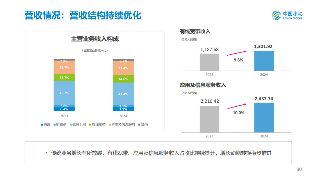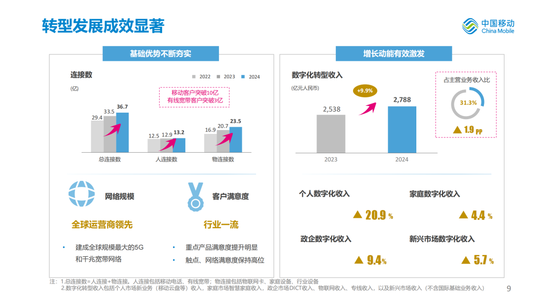 2024年,中国移动全年营运收入达到人民币10,408亿元,同比增长3.1%,其中通信服务收入达到人民币8,895亿元,同比增长3.0%。总连接数达到36.70亿,净增3.16亿。CHBN中HBN收入占通信服务收入比达到45.6%,同比提升2.4个百分点。数字化转型收入达到人民币2,788亿元,同比增长9.9%,占通信服务收入比达到31.3%,较上年提升1.9个百分点。