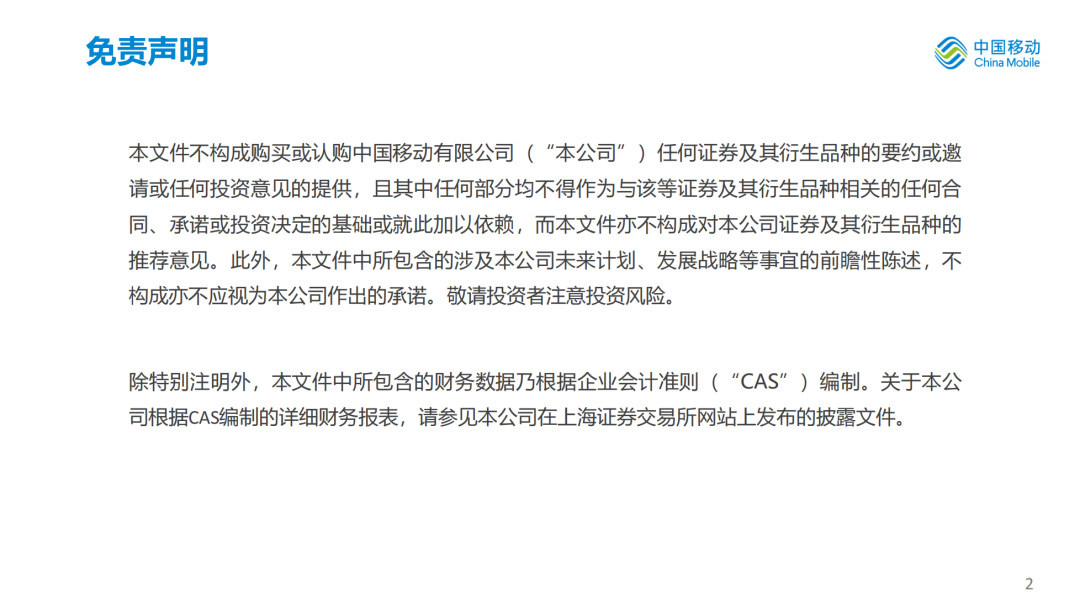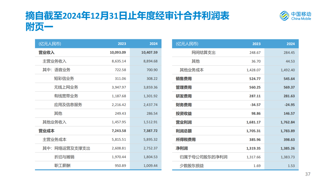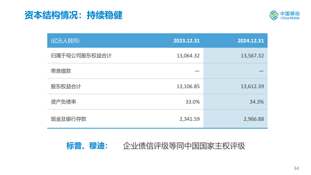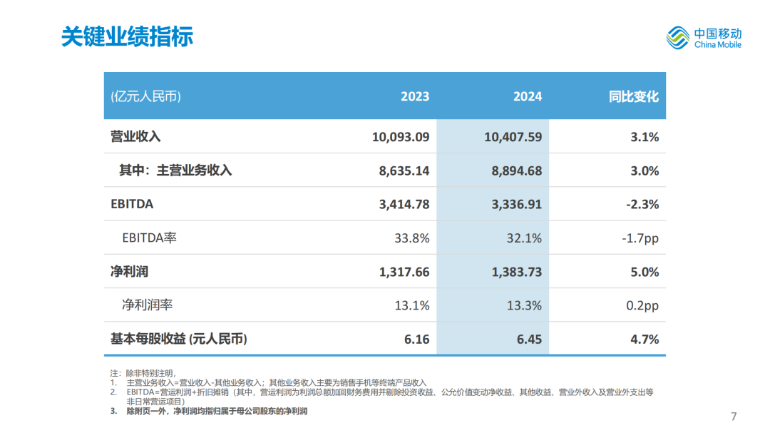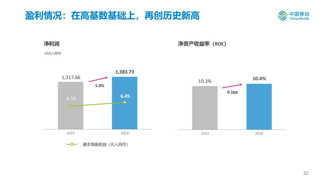 股东应占利润为人民币1,384亿元,同比增长5.0%,每股盈利为人民币6.45元;EBITDA为人民币3,337亿元,EBITDA占通信服务收入比为37.5%,盈利能力继续保持国际一流运营商领先水平。资本开支为人民币1,640亿元,资本开支占通信服务收入比为18.4%,同比下降2.5个百分点。自由现金流为人民币1,517亿元,同比增长22.9%。