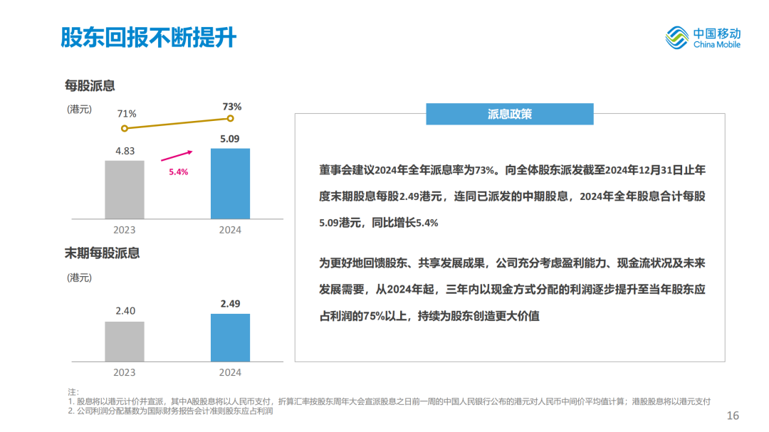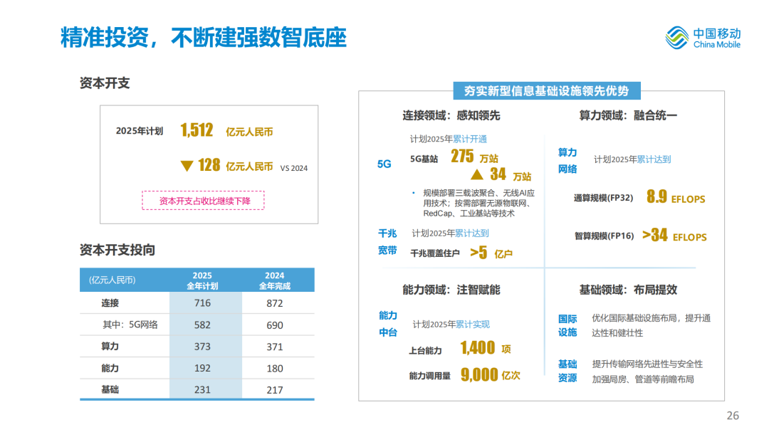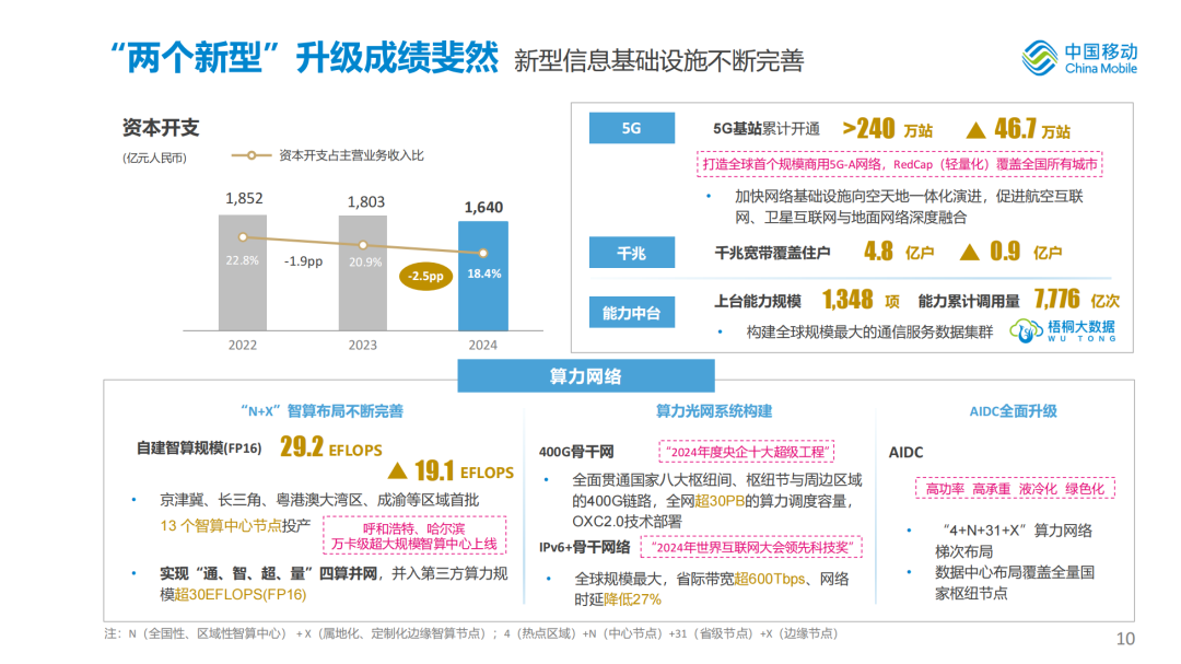 2024年完成资本开支1,640亿元,占收比为18.4%,同比下降2.5个百分点。“双千兆”保持领先。累计开通5G基站超240万个,打造全球首个规模商用5G-A网络,RedCap覆盖全国所有城市,千兆宽带覆盖住户达到4.8亿户。算力网络持续引领。智算规模达到29.2 EFLOPS,净增19.1 EFLOPS,呼和浩特、哈尔滨万卡级超大规模智算中心上线提供服务,400G骨干网入选“2024年度央企十大超级工程”,数据中心向AIDC全面升级。能力中台应用扩大。上台能力规模达到1,348项,能力累计调用量达到7,776亿次。