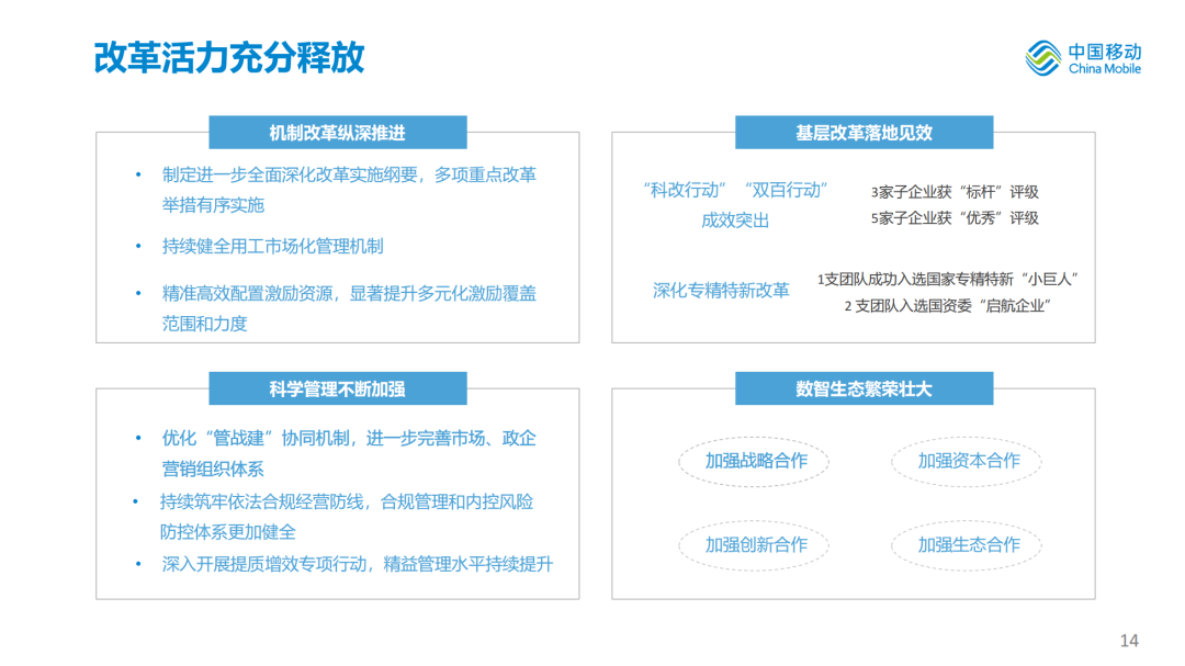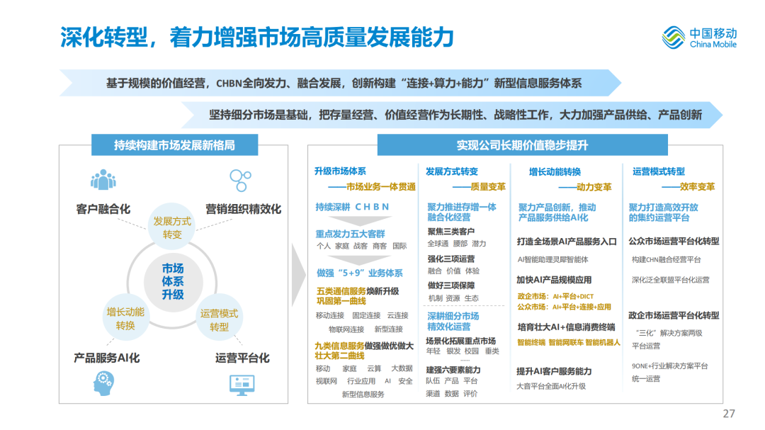 公司统筹推进CHBN全向发力、融合发展,始终以客户为中心,坚持细分市场是基础,把存量经营、价值经营作为长期性、战略性工作,大力加强产品供给、产品创新,基础优势不断夯实,增长动能有效激发。