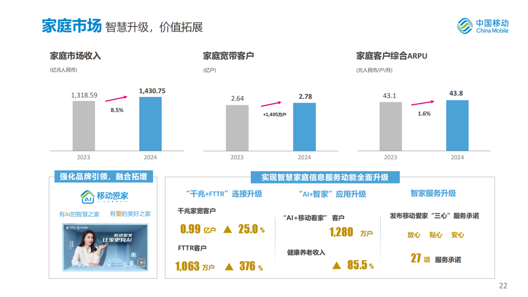 我们着力构建“全千兆+云生活”智慧家庭生态,以“移动爱家”品牌为引领,积极推动“千兆+FTTR”连接升级、“AI+智家”应用升级、智家服务升级,家庭市场实现良好增长。2024年,家庭市场收入达到人民币1,431亿元,同比增长8.5%;家庭宽带客户达到2.78亿户,净增1,405万户,规模行业领先,其中千兆家庭宽带客户达到0.99亿户,同比增长25.0%,FTTR客户达到1,063万户,同比增长376%。“AI+移动看家”客户达到1,280万户。家庭客户综合ARPU达到人民币43.8元,同比增长1.6%。