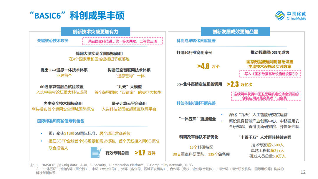 公司荣获国家科技进步奖一等奖两项、二等奖三项。创新技术突破更加有力。关键核心技术攻关方面,算网大脑实现全国规模商用,提出业界首个5G-A通感一体技术体系,6G通感智算融合实验装置入选中关村论坛重大科技成果,“九天”大模型成为首个获得国家“双备案”的央企大模型,量子计算云平台入选科技部国家超算互联网平台。标准专利方面,牵头5G国际标准数量居全球运营商首位,担任3GPP全球首个6G标准项目联合报告人,有效专利总量超1.7万件。创新发展成效更加凸显。科创成果转化贡献显著,打造5G行业商用案例超4.8万个,推动数联网成为国家数据流通利用基础设施主流技术路线之一。科创体制机制不断完善,“一体五环”更加健全,科研改革梯队不断优化,“十百千万”人才雁阵持续建强。