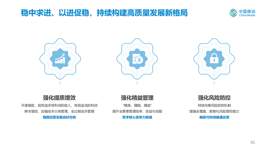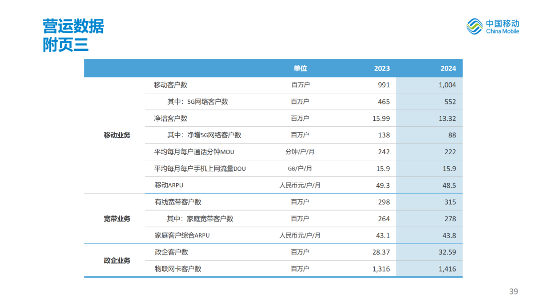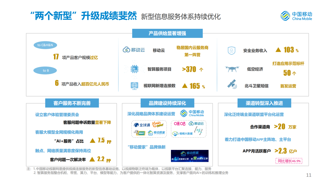 产品供给显著增强。公众市场17项产品客户规模过亿,政企市场6项产品收入规模超百亿。移动云稳居国内云服务商第一阵营,拓展智算服务项目超370个,视联网新增连接数同比增长165%,安全业务收入同比增长103%,打造低空经济应用示范标杆50个,北斗卫星短信首发运营。客户服务不断完善,“AI+服务”占比不断提升;品牌建设持续深化,“移动爱家”品牌焕新广受欢迎;渠道转型深入推进,中国移动APP月活跃客户超2.3亿户,同比增长46.9%。