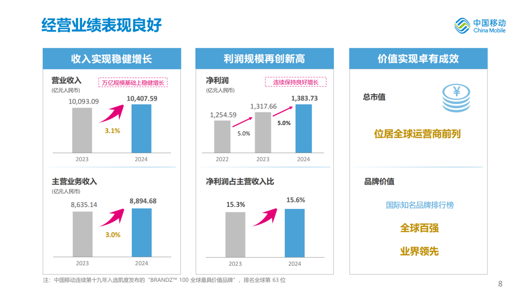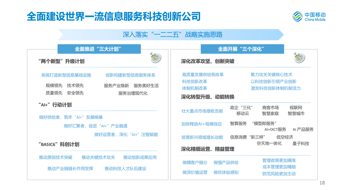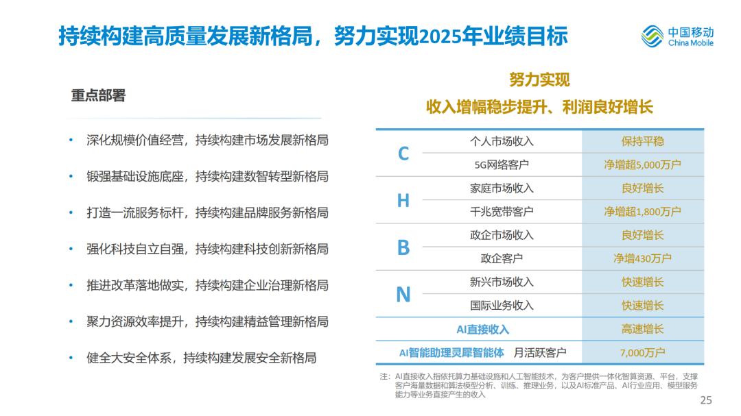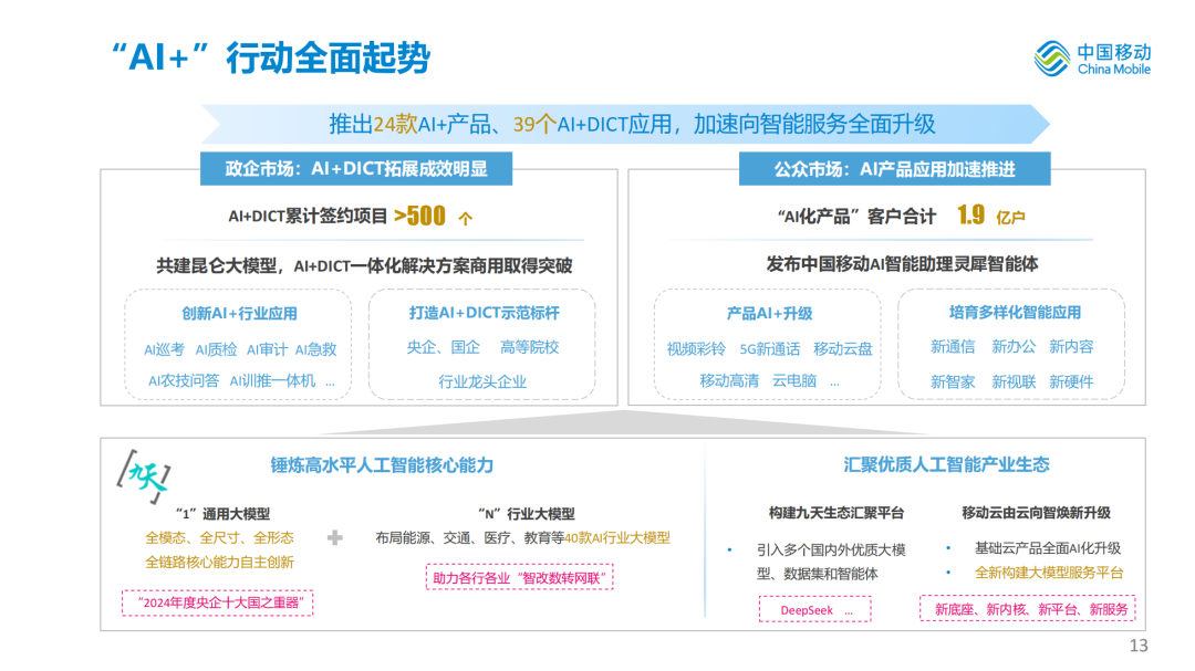 推出24款AI+产品、39个AI+DICT应用,加速向智能服务全面升级。政企市场,形成超百个覆盖央企国企、高等院校、行业龙头企业的AI+DICT示范标杆,成功签约项目超500个。公众市场,“AI化产品”客户合计达到1.9亿户,发布中国移动AI智能助理灵犀智能体。