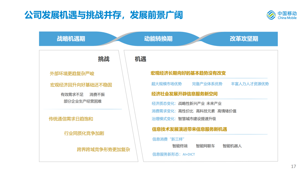 公司发展既面临诸多压力挑战,更有广阔潜力空间,已经进入战略机遇期、动能转换期、改革攻坚期交织的关键阶段。一方面,外部环境更趋严峻复杂,宏观经济回升向好基础还不稳固,有效需求不足,消费不振,部分企业生产经营困难;传统通信需求日趋饱和,行业同质化竞争加剧,跨界跨域竞争形势更加复杂。另一方面,公司转型发展迎来宝贵机遇。一是宏观经济长期向好的基本趋势没有改变,拥有超大规模市场、完备产业体系、丰富人力人才资源等诸多优势条件。二是经济社会发展开辟信息服务新空间,战略性新兴产业和未来产业加快发展,传统产业改造升级提质加速,高性价比、高科技元素、高情绪价值美好数字生活需求日益增长,智慧城市建设提速升级。三是信息技术发展演进带来信息服务新机遇,嵌入AI智能体的智能终端、智能网联车、智能机器人正加速成为覆盖“人、车、家”生活场景的信息消费“新三样”;AI+DICT成为信息服务新形态,推动“模型即服务”等新生产平台加速普及。