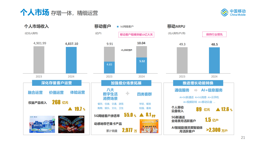 我们强化“连接+应用+权益+硬件”发展策略,持续深化存量客户融合运营、价值运营、体验运营,不断加强基于客户细分的场景拓展,深入推进AI+信息服务收入增长动能转换,个人市场保持平稳。2024年,个人市场收入达到人民币4,837亿元;移动客户突破10亿户,净增1,332万户,其中5G网络客户达到5.52亿户,净增0.88亿户,渗透率达到55.0%。个人移动云盘收入达到人民币89亿元,同比增长12.6%;权益产品收入达到人民币268亿元,同比增长19.7%;5G新通话全场景月活跃客户达到1.5亿户,其中智能应用订购客户达到3,475万户。移动ARPU保持行业领先,为人民币48.5元。