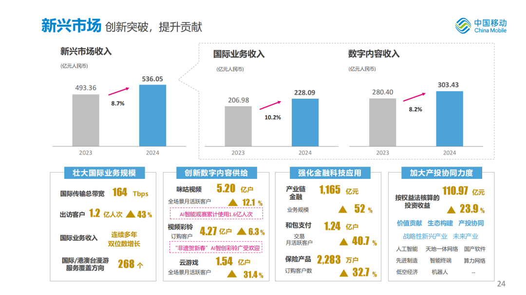 我们着力推动国际业务、数字内容、金融科技、股权投资四大板块创新拓展,新兴市场实现良好增长。2024年,新兴市场收入达到人民币536亿元,同比增长8.7%。国际业务方面,进一步发挥国内国际两个市场联动效应,加强优质产品能力和解决方案出海,服务“一带一路”建设,推进海外数字基础设施升级,持续深化国际领域生态合作,全年国际业务收入达到人民币228亿元,同比增长10.2%。数字内容方面,做强数智文创与新质内容运营,精心打磨咪咕视频等“硬核”产品,2024年数字内容收入达到人民币303亿元,同比增长8.2%,咪咕视频全场景月活跃客户达到5.2亿户,咪咕视频AI智能观赛累计使用达到1.6亿人次。金融科技方面,打造“通信+金融”融合生态,全年产业链金融业务规模达到人民币1,165亿元,同比增长52%;和包交易月活跃客户达到1.24亿户,同比增长40.7%。股权投资方面,围绕战略性新兴产业、未来产业关键领域进行投资布局,资本纽带和赋能作用进一步发挥。