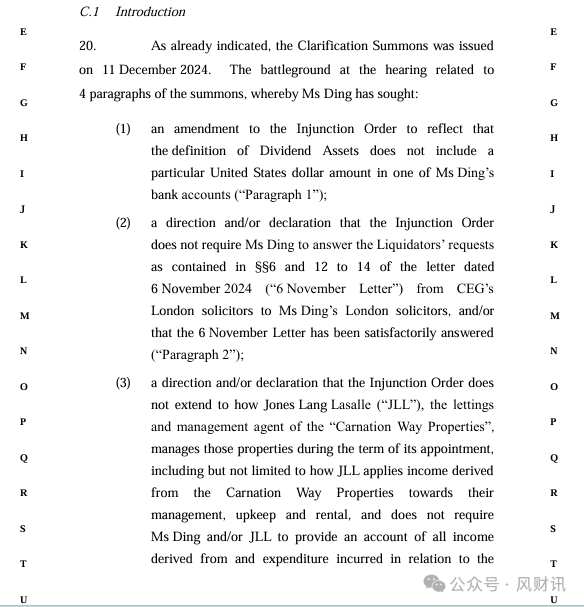 不过英国法院(在清算人的同意下)已经给丁玉梅下达了某些“禁制令”。丁玉梅声称,由于禁制令,第三方服务机构JLL无法自由管理其拥有的英国出租物业Carnation Way Properties,这给她造成了不利影响。