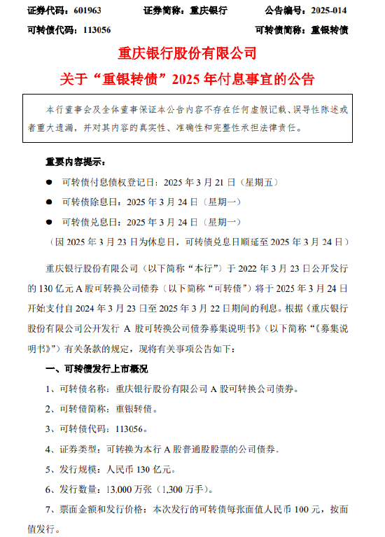 3月17日金融一线消息,重庆银行发布公告称,该行于2022年3月23日公开发行的130亿元A股可转换公司债券(以下简称“可转债”)将于2025年3月24日开始支付自2024年3月23日至2025年3月22日期间的利息。