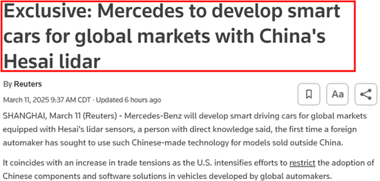 2025年3月10日,市场收盘后,禾赛发布了平淡的财报,导致其股价在盘后交易中迅速下跌了17%。然而,第二天市场开盘之前,突然出现了一些神秘的报道,称禾赛与奔驰达成了一项可能非常有利可图的交易,将利用禾赛的激光雷达开发“面向全球市场的智能汽车”。