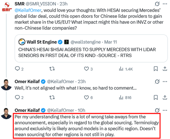 值得注意的是,禾赛的竞争对手进一步支持我们的观点,认为这个所谓的“独家”合同很可能是虚幻的。