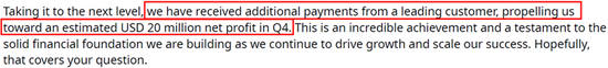 在那次财报电话会议上,禾赛的CFO表示,公司将接近1亿美元的收入,并预计净利润为2000万美元,因为它收到了来自一家领先客户的额外支付。然而,公司未披露这一额外支付的真实性质。