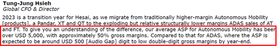 禾赛提供两类激光雷达产品:ADAS(高级驾驶辅助系统)和自动驾驶(现在称为机器人)。在2023年3月,禾赛的首席财务官披露,自动驾驶激光雷达的ASP是ADAS激光雷达的10倍,而自动驾驶激光雷达的毛利率约为ADAS激光雷达的5倍。