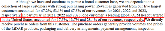 根据禾赛2023年的20-F文件,其最大客户是总部位于美国的一家领先全球的OEM。这家领先客户在2023年贡献了28.4%的收入,即5.33亿元人民币。