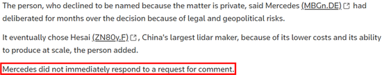 如果这真是一个重大的实质性合作,为什么奔驰不正式确认甚至评论这一交易?过去,奔驰会自豪地宣布新的激光雷达合作伙伴关系。为什么这次没有?
