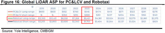 前Velodyne高管的估算与领先行业报告Yole Intelligence中的ASP数据一致,并得到了证实。咨询公司Yole的报告指出,2023年自动驾驶长距离激光雷达的平均售价为5,451美元,Yole的报告具有高度可信度,甚至禾赛在公司的招股书中也引用了该报告。