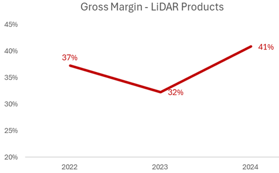 根据公司文件,其激光雷达产品的毛利率从2023年的32%上升到2024年的41%。
