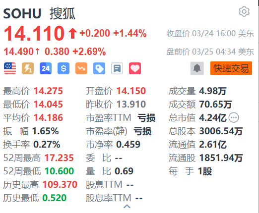 搜狐(SOHU.US)盘前涨2.69%,报14.49美元。消息面上,富瑞分析师Thomas Chong维持搜狐“买入”评级,并将目标价从15.2美元上调至17美元。(格隆汇)