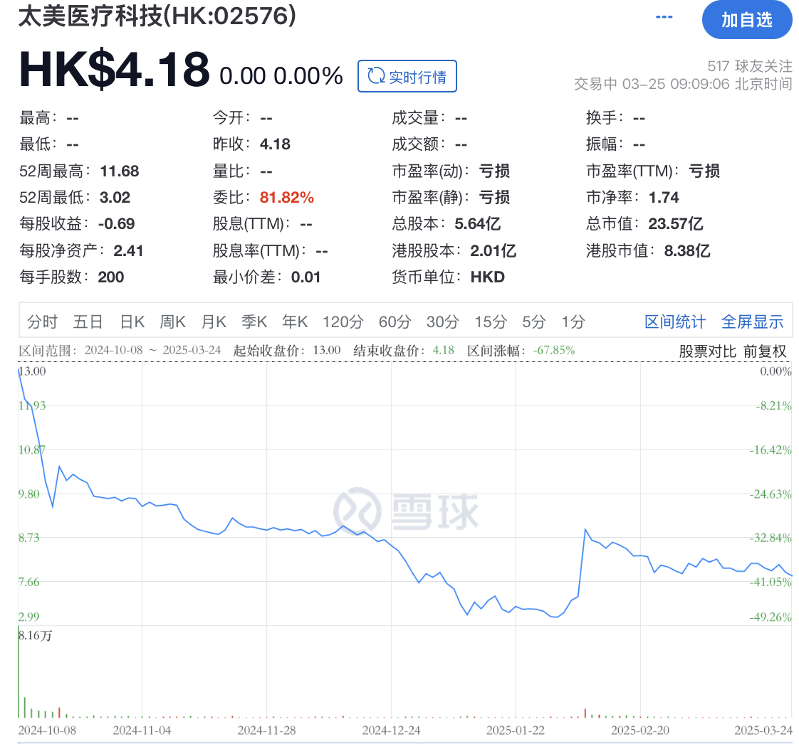 太美医疗科技曾在2021年12月向科创板递交招股书,但2023年3月IPO未能过会,最终选择了转战港股。2024年10月,太美医疗科技在港交所上市,发行价为13港元/股,不过,上市首日即破发,上市以来股价已跌超六成。