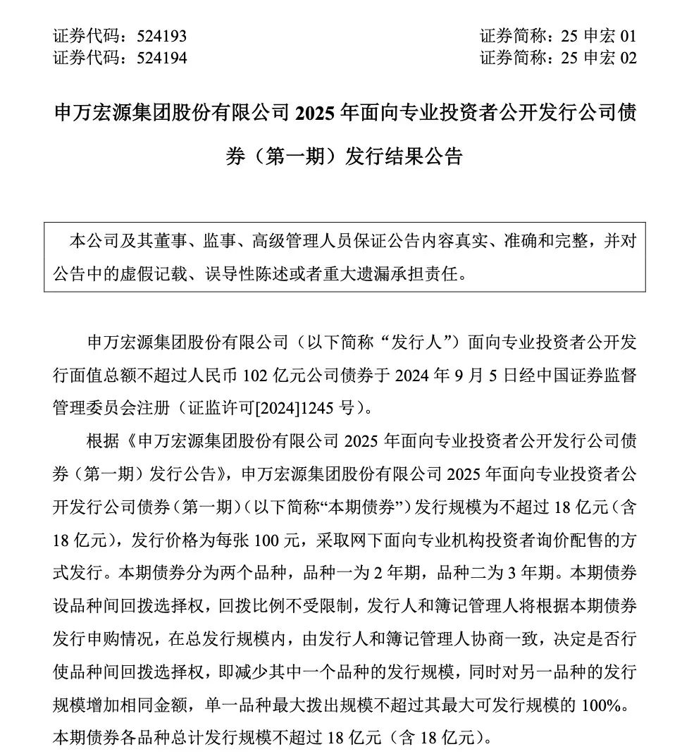 依据《申万宏源集团股份有限公司2025年面向专业投资者公开发行公司债券(第一期)发行公告》,本次发行的“本期债券”发行规模不超过18亿元(含18亿元),每张发行价格为100元,采用网下面向专业机构投资者询价配售的方式进行。