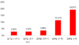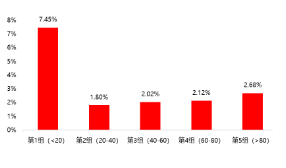 回购比例(回购数量占总股本数)与超额收益率正相关。根据回购比例不同,把公司分为5组:第1组(<0.1%)、第2组(0.1%-0.5%)、第3组(0.5%-1%)、第4组(1%-5%)、第5组(>5%)。回购预案公告日90日后,高回购比例公司的超额收益更高,第5组和第4组的90日超额收益率分别为4.48%和4.36%,其他组别超额收益率仅不足1.5%。从回购预案日至完成日的区间超额收益来看,回购比例与超额收益率正相关,回购比例<0.1%组别的区间超额收益率仅为2.81%,而回购比例>5%组别的超额收益率高达19.27%。