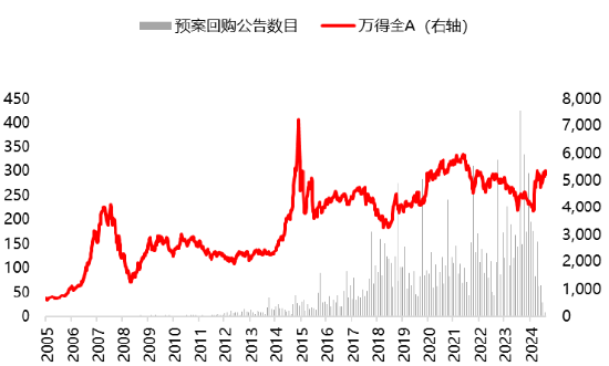 图7:2005年以来A股预案回购公告数目与万得全A指数对比