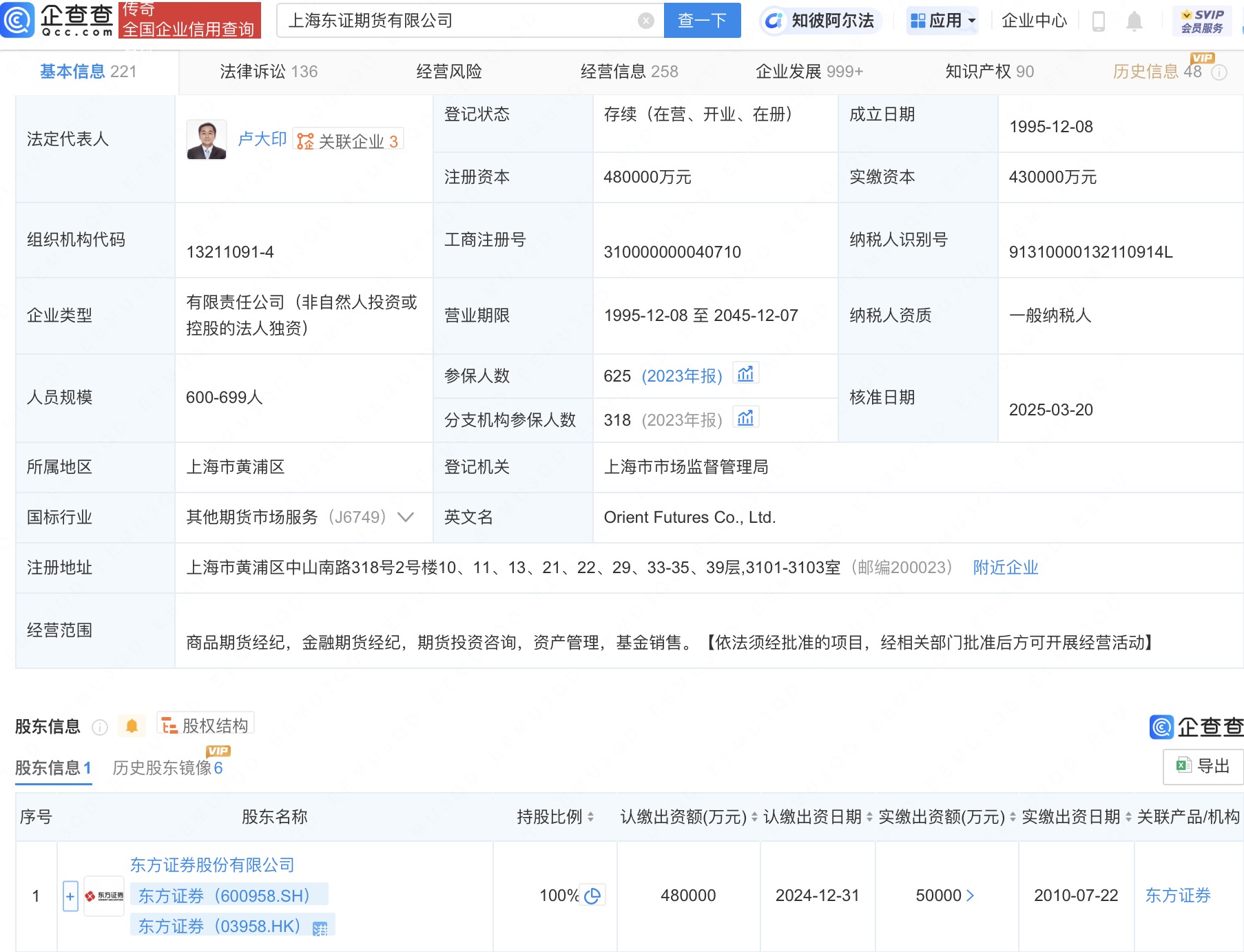 企查查信息显示,该公司成立于1995年,法定代表人为卢大印,经营范围为商品期货经纪、金融期货经纪、期货投资咨询、资产管理、基金销售,由东方证券全资持股。
