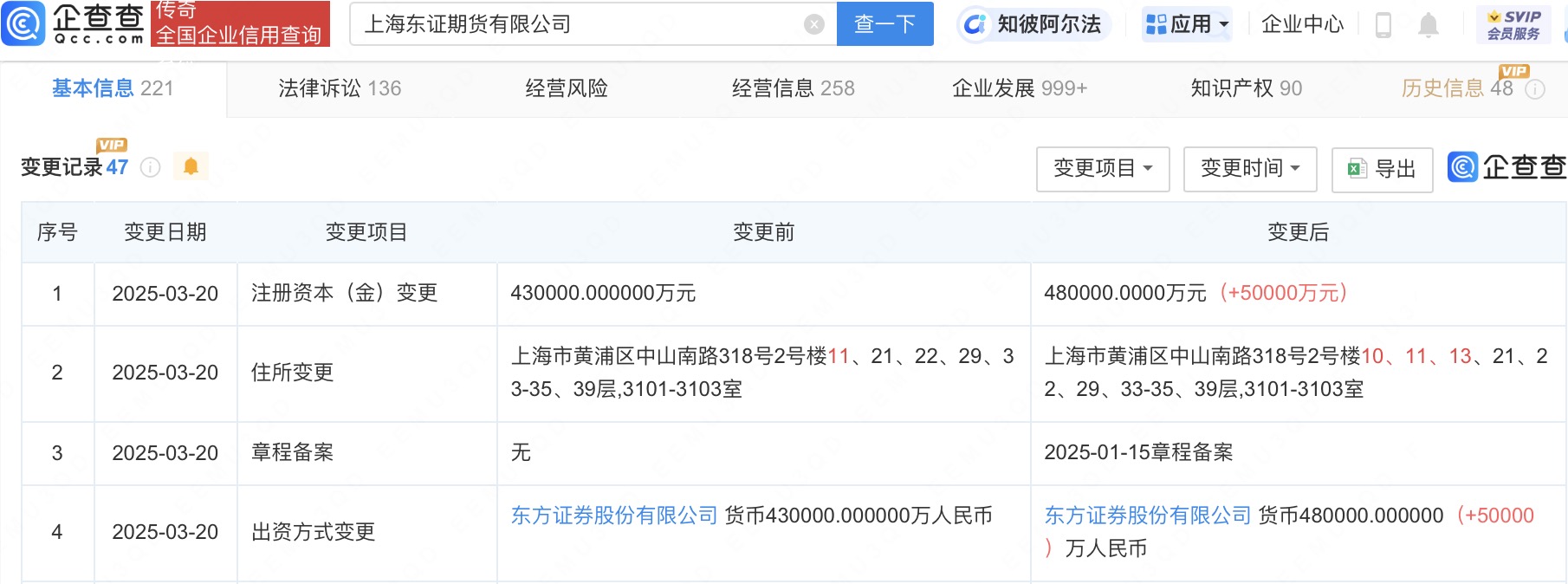 上证报中国证券网讯 企查查APP显示,近日,上海东证期货有限公司发生工商变更,注册资本由43亿元人民币增至48亿元人民币。