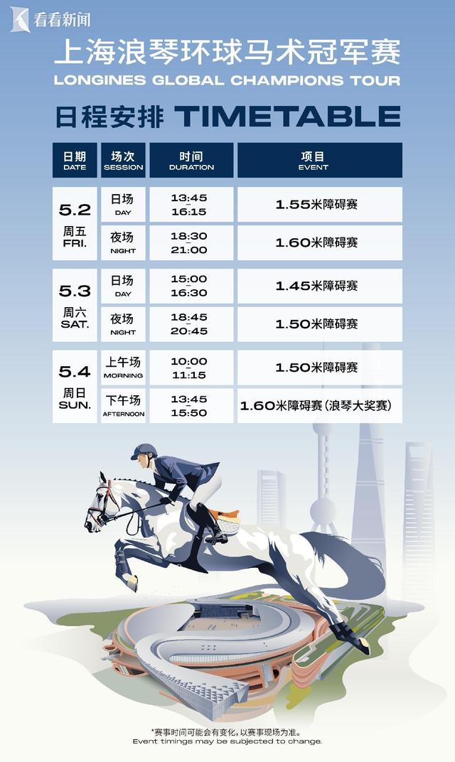 今年,5月2日、3日的比赛依然将分日、夜场举行。最受瞩目的1.60米浪琴大奖赛将在5月4日下午场开赛;而5月2日的夜场比赛则是环球马术冠军联赛(GCL)的第二回合,障碍高度同样为1.60米。全球仅百余匹赛马能跨越这一障碍高度,极具可看性。