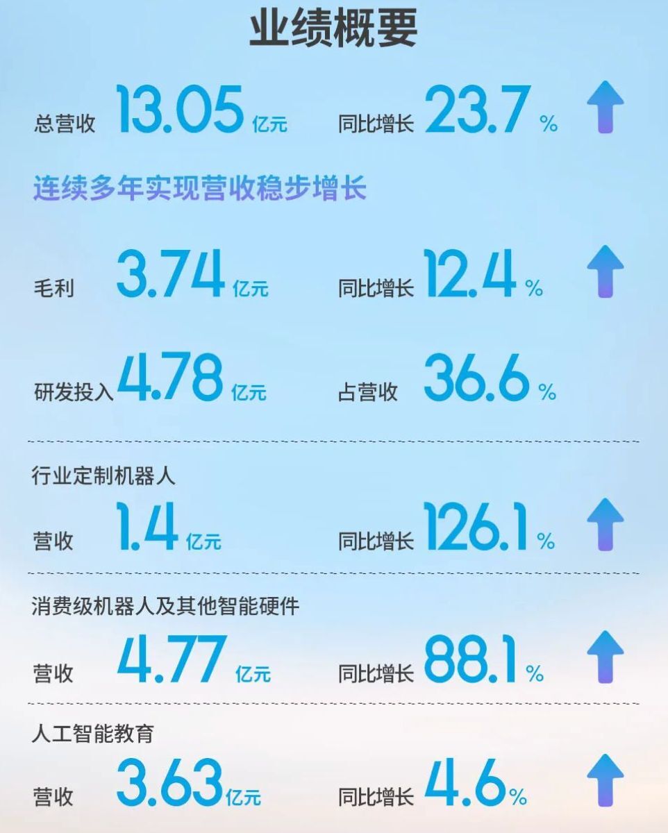 财报显示,2024年优必选全年总收入13.05亿元,同比增长23.7%,至今已连续多年实现营收稳步增长;毛利3.74亿元,同比增长12.4%,亏损同比收窄8.3%。