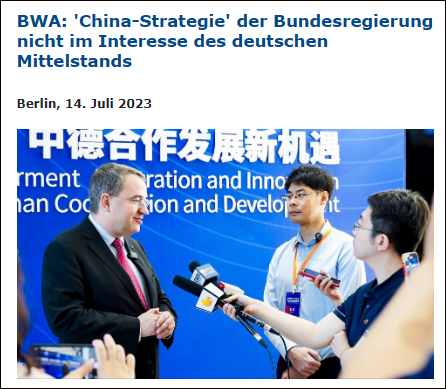 2023年7月,德国商会“联邦经济发展与对外贸易协会”协会主席米夏埃尔·舒曼表示,不欢迎德国政府发布的“中国战略”,认为将影响中德贸易关系、不符合在华德企利益。