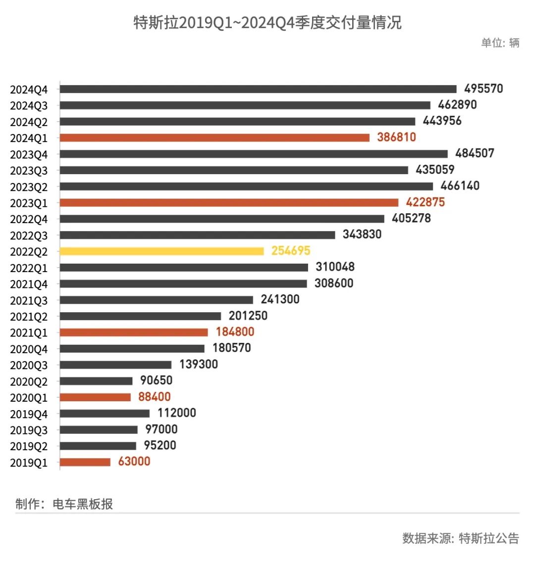 特斯拉2024年交付量同比下降1.1%至178.9万辆,出现十多年来的首次下滑。在2024年Q3财报电话会上,马斯克对2025年的交付增长预期为20%~30%。但到了今年1月底的Q4财报电话会,他仅提及全年将重回增长轨道。