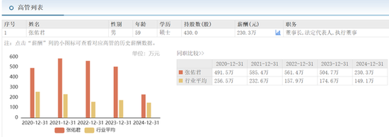 拉长时间来看,2020年至2024年,张佑军薪酬分别为491.5万元、585.4万元、561.4万元、504.7万元及230.3万元。其中,其2024年薪酬较2023年下降了274.4万元,降幅54.37%。
