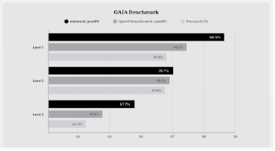 根据官网资料,Manus在GAIA(General Artificial Intelligence Assistant benchmark)的基准测试中, 在所有三个难度级别上都取得了新的SOTA(state of the art)表现, 超越Open AI同级产品。