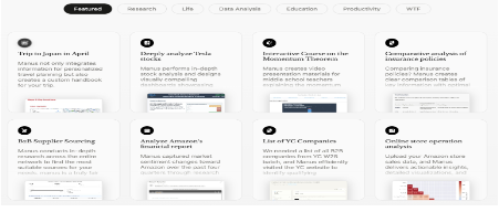 在实际使用当中,目前Manus已提供多种处理现实世界任务的案例,包括个性化旅行规划(整合旅行信息、为用户创建定制旅行手册)、深度股票分析(全面股票洞察)、保险政策比较(创建保险政策比较表)、供应商采购(找到最适合用户需求的供应商)、财务报告分析(研究和数据分析捕捉市场对特定公司的情绪变化)、专业数据整理(创业公司列表整理)、教育内容创建(为中学教师创建视频演示材料)等。