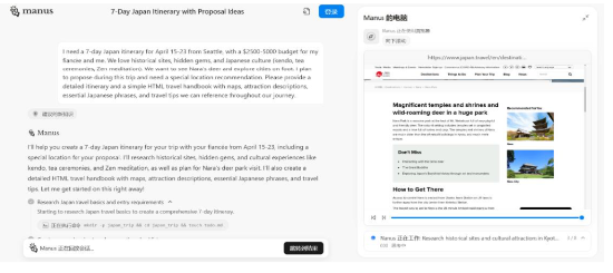 此外,Manus 支持文本、文档、压缩包等多种类型的输入。在指令发出后,Manus 能够在虚拟机内自行配置和使用终端、编辑器、浏览器等工具,完全自主地实现复杂任务的拆解、规划与异步执行。在执行期间,页面左侧显示有系统当前的运行状态,右侧则显示正在访问的页面或整体进度。由于 Manus 是在云中异步工作的,一方面用户可以同时运行多个 Manus 会话,并行执行不同任务;同时用户也可以在任务执行过程中关闭计算机,Manus 将在后台继续运行,并且会在任务完成后发送通知。此外,Manus 也支持任务执行过程中的实时交互。