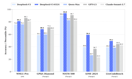 3月25日,DeepSeek 宣布V3 模型已完成小版本升级,目前版本号 DeepSeek-V3-0324,根据官方公众号描述,DeepSeek-V3-0324 与之前的 DeepSeek-V3 使用同样的 base 模型,仅借鉴了DeepSeek-R1 版本模型训练过程中所使用的强化学习技术,便大幅提高了在推理类任务上的表现水平,在数学、代码类相关评测集上取得了超过 GPT-4.5 的得分成绩。