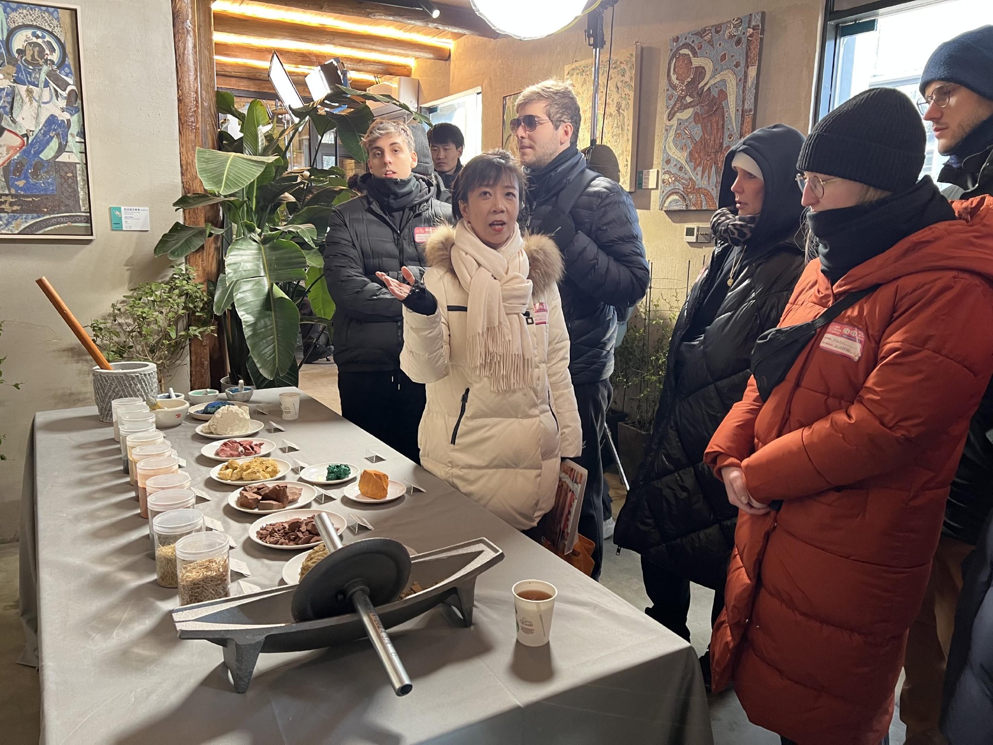 周日上午,阳光洒进安澜山外艺术中心所在的老四合院,正在参观的20多名外国游客对这里的一砖一瓦都十分好奇。推门进屋,满墙的敦煌和克孜尔壁画瞬间抓住所有人的目光——一场石窟壁画艺术展正在举行。
