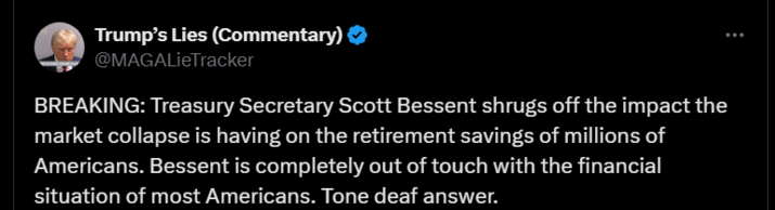 社交平台博主“特朗普的谎言”写道:“贝森特完全不了解大多数美国人的财务状况。”