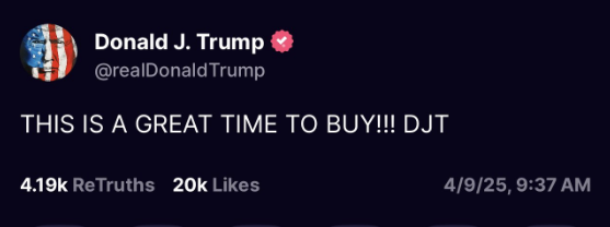 就在宣布政策变化前约4小时,特朗普在他创立的“真实社交”平台上发帖,以大写英文字母写道:“这是买入的大好时机!!!DJT。”