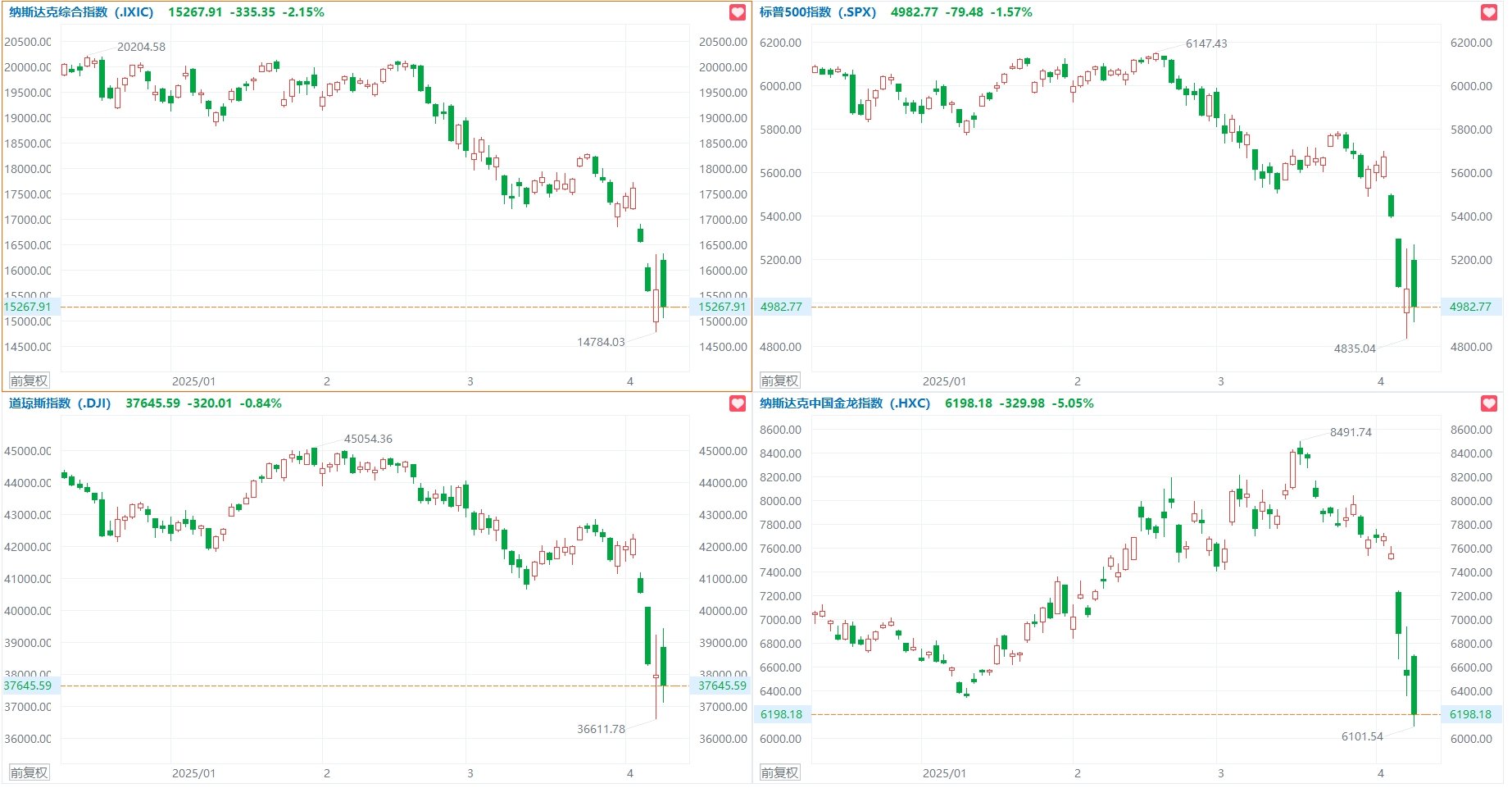 格隆汇4月9日|美股冲高回落,三大指数集体大跌,纳指收跌2.15%,道指收跌0.84%,标普500指数收跌1.57%录得四连跌,纳指、标普500指数盘中一度涨超4%。