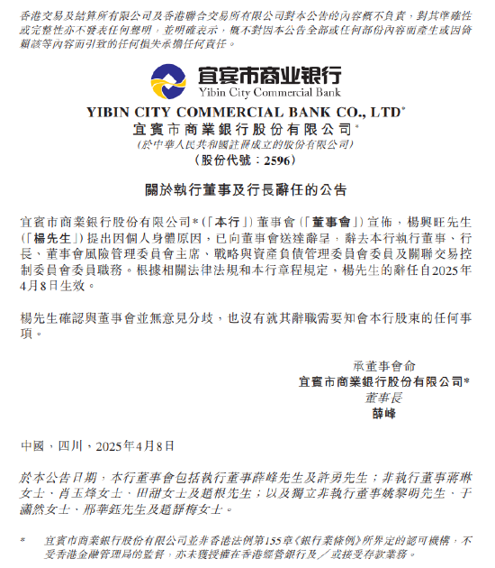 4月8日金融一线消息,宜宾银行公告称,杨兴旺因个人身体原因,辞去宜宾银行执行董事、行长、董事会风险管理委员会主席、战略与资产负债管理委员会委员及关联交易控制委员会委员职务,辞任自2025年4月8日生效。