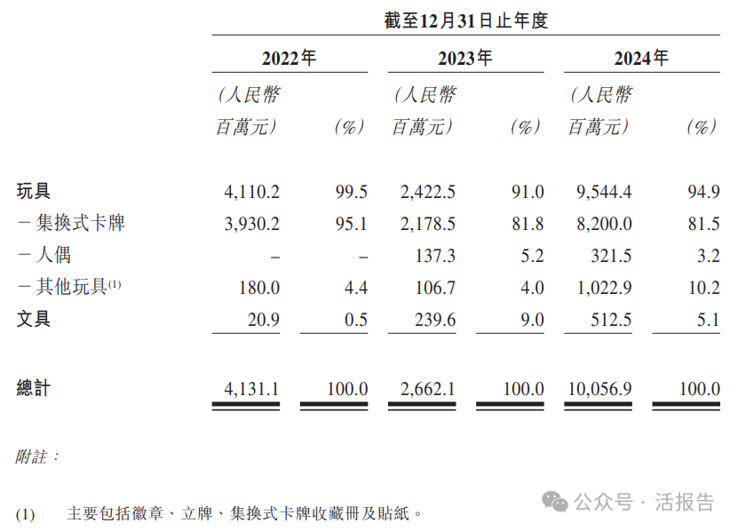 玩具,尤其是集换式卡牌,是公司的核心产品。公司集换式卡牌产品的产品系列推出周期通常为二至三个月,文具的产品系列推出周期通常为二至八个月。于2022年、2023年及2024年,公司分别推出(i)190个、236个及363个玩具系列,包括同期的168个、167个及210个集换式卡牌系列;及(ii)六个、64个及58个文具系列。