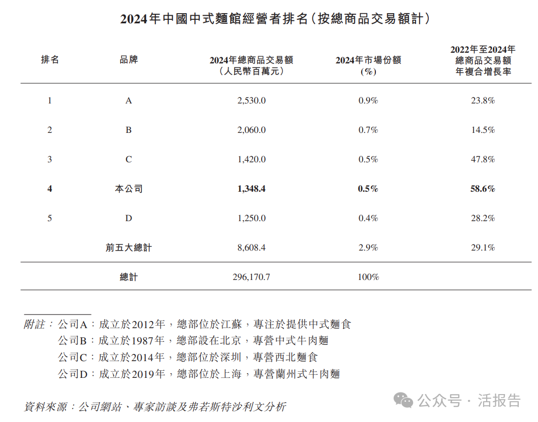 根据弗若斯特沙利文报告,2024年,按总商品交易额计,该公司为第四大中式面馆经营者,市场份额为0.5%。值得注意的是,按总商品交易额计,公司亦为最大的川渝风味面馆经营者, 且2022年至2024年连续三年,在中国所有餐饮连锁企业中,重庆小面、红碗豌杂面和金碗酸辣粉的线下销量排名第一。